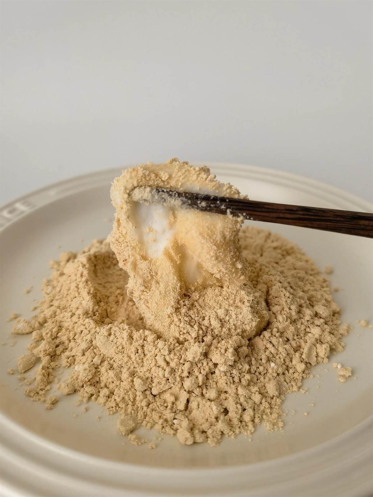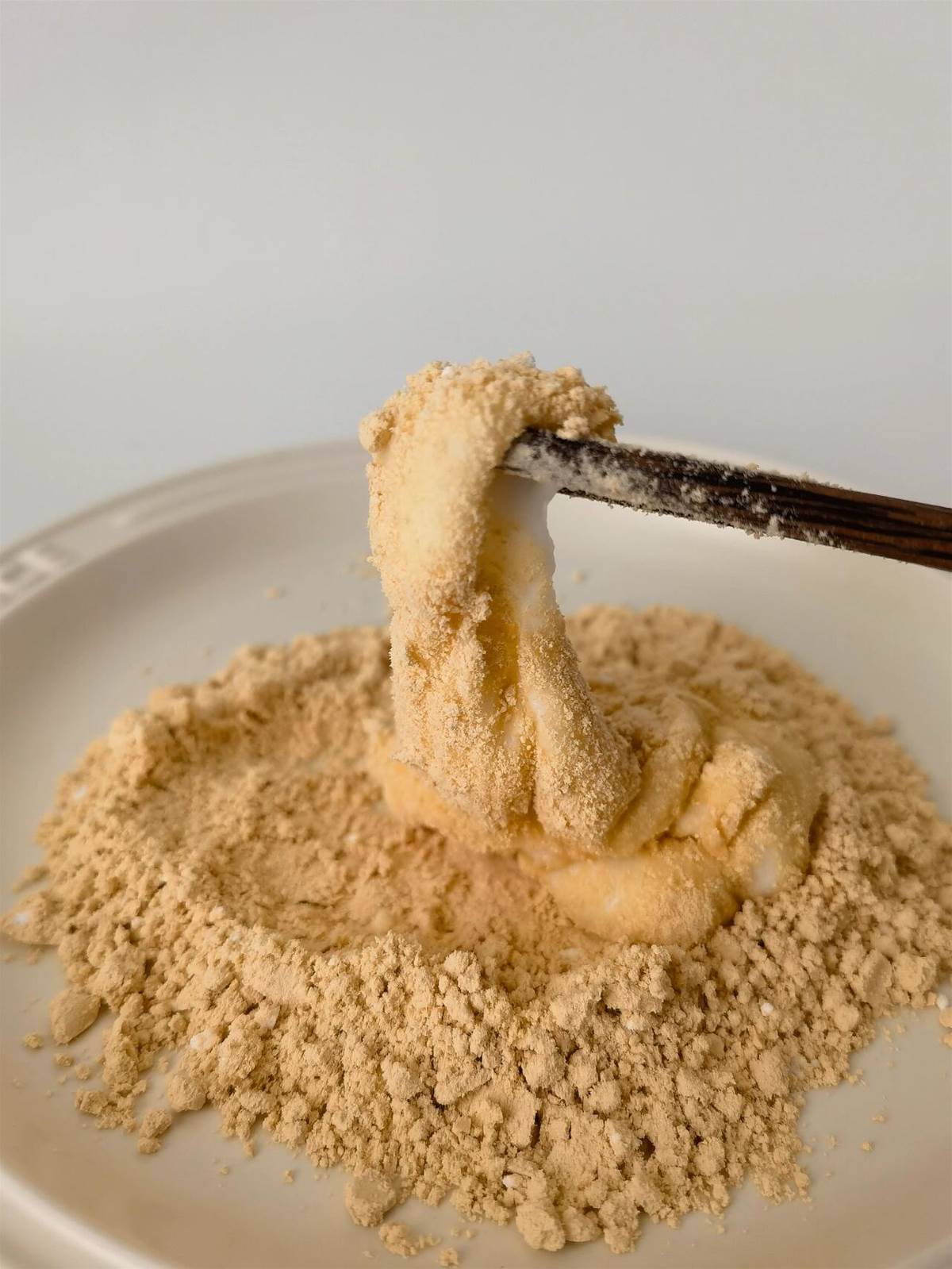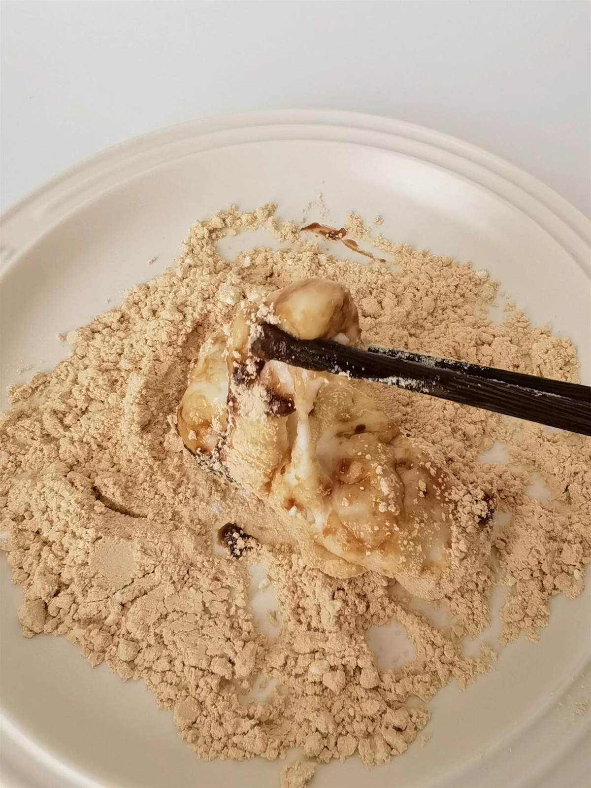 4.將一半的蘸料鋪在盤子底部,鋪上一部分麻薯,再撒上另一半蘸料在麻薯表面,即可享用~