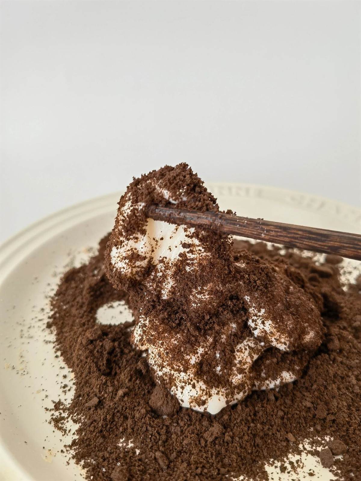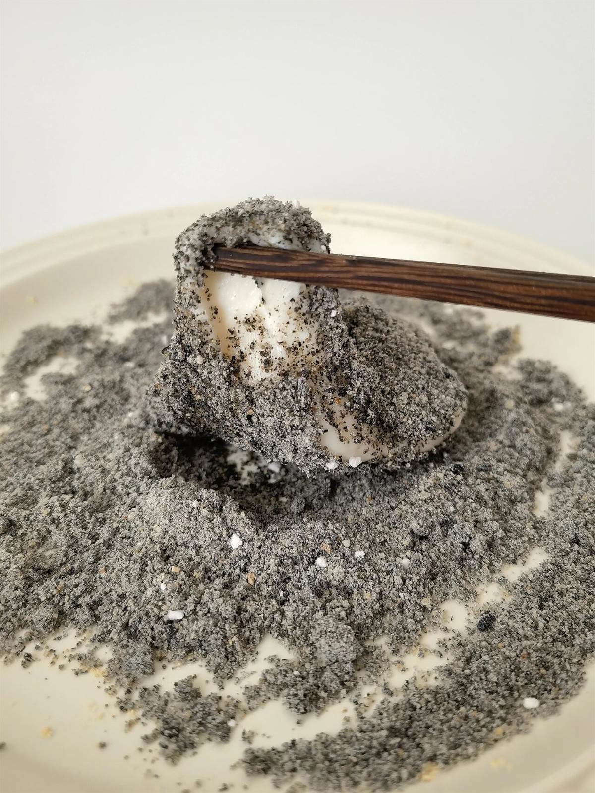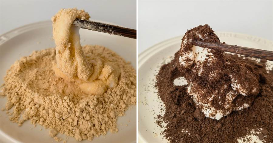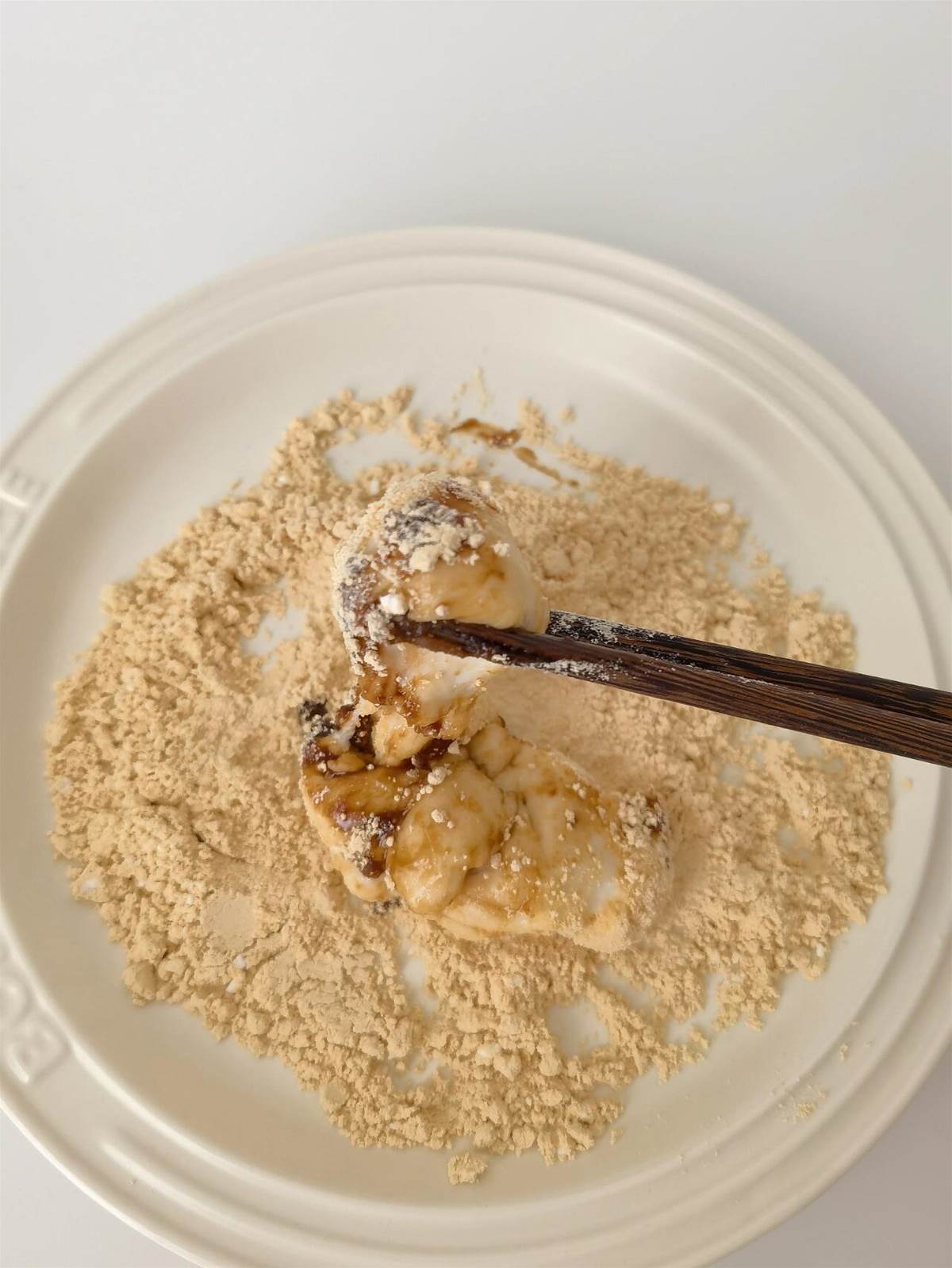 4.將一半的蘸料鋪在盤子底部,鋪上一部分麻薯,再撒上另一半蘸料在麻薯表面,即可享用~