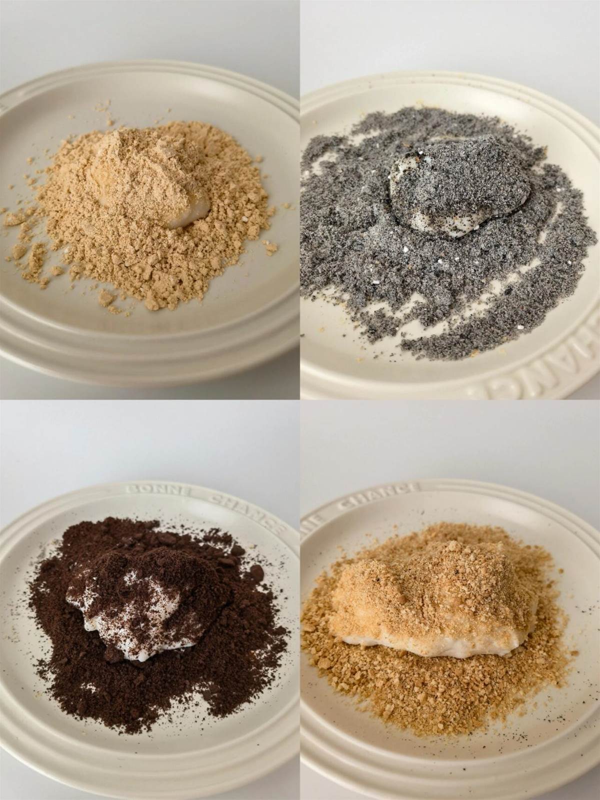 1.把蘸料準備好,黑芝麻、黃豆粉,分別和砂糖混合後打成粉,堅果類的和砂糖混勻後打成粉,奧利奧去掉夾心敲碎;